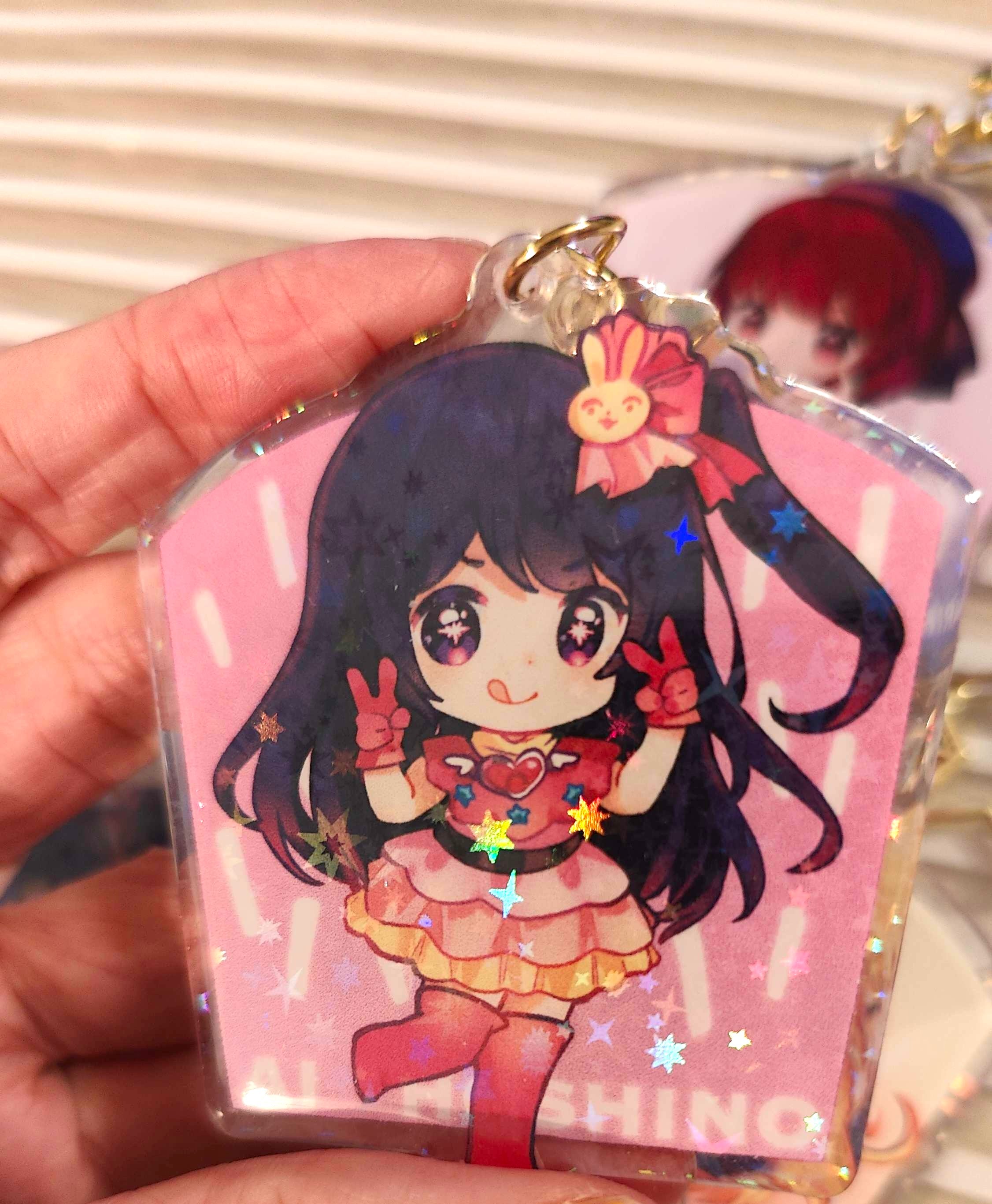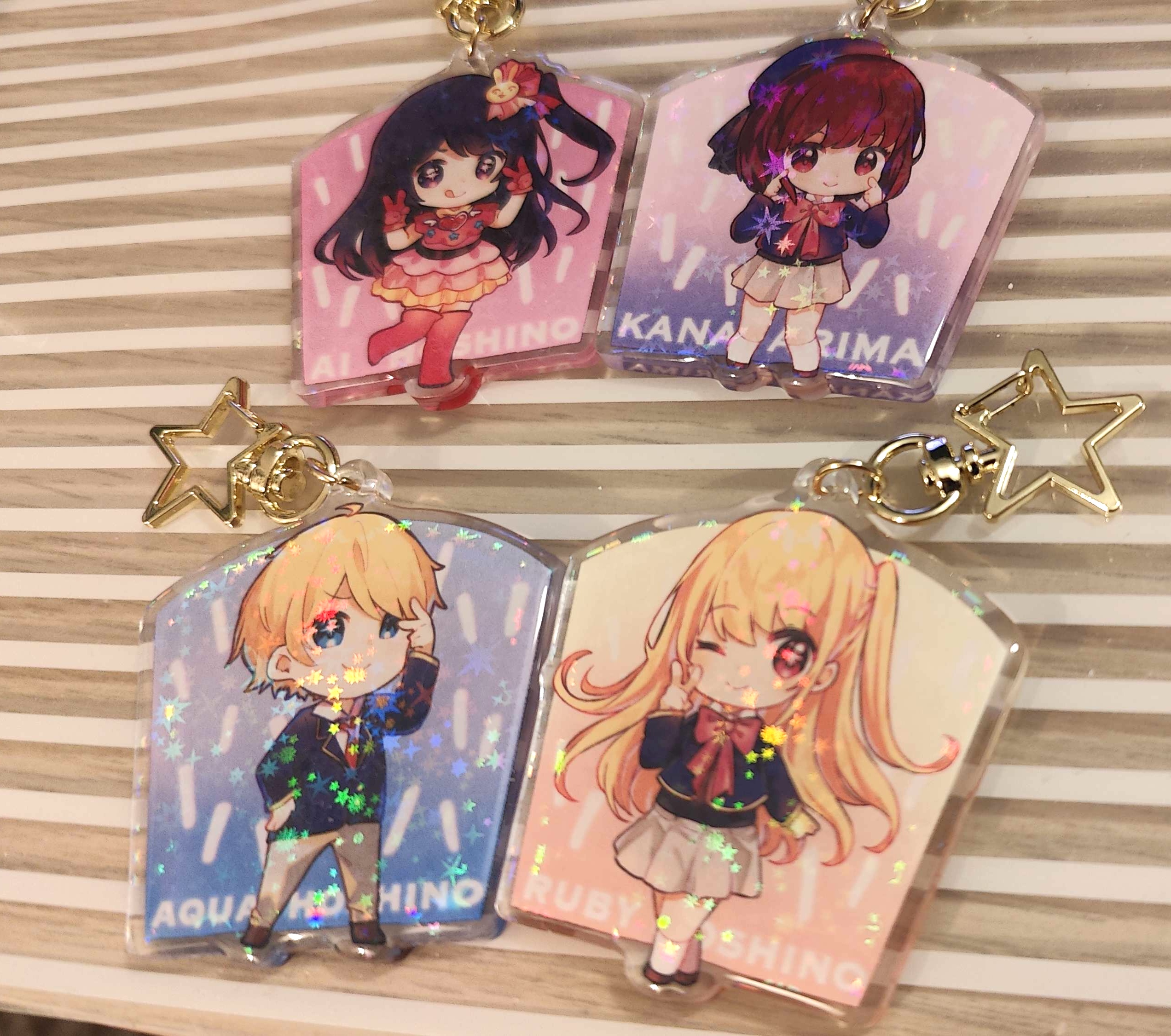My star, my idol, my oshi!! Choose your favorite character and support their activities with these acrylic charms! They are 2.5inch in size, double-sided with epoxy and rainbow stars in the front. The stars colors vary according to the light. The front and back side have different expressions (happy and corrupted) (except for Kana. Kana is just cute and happy on both sides.)