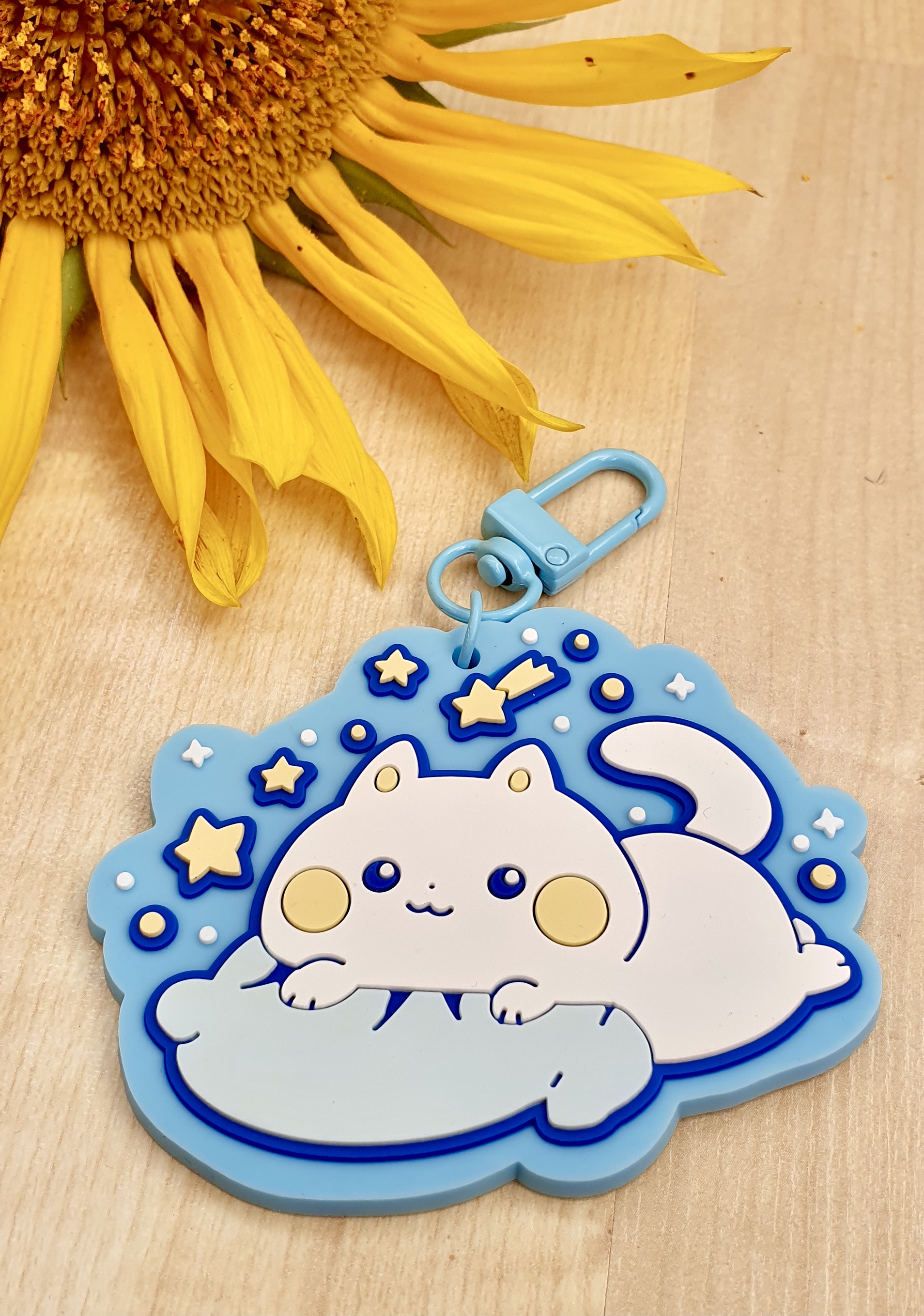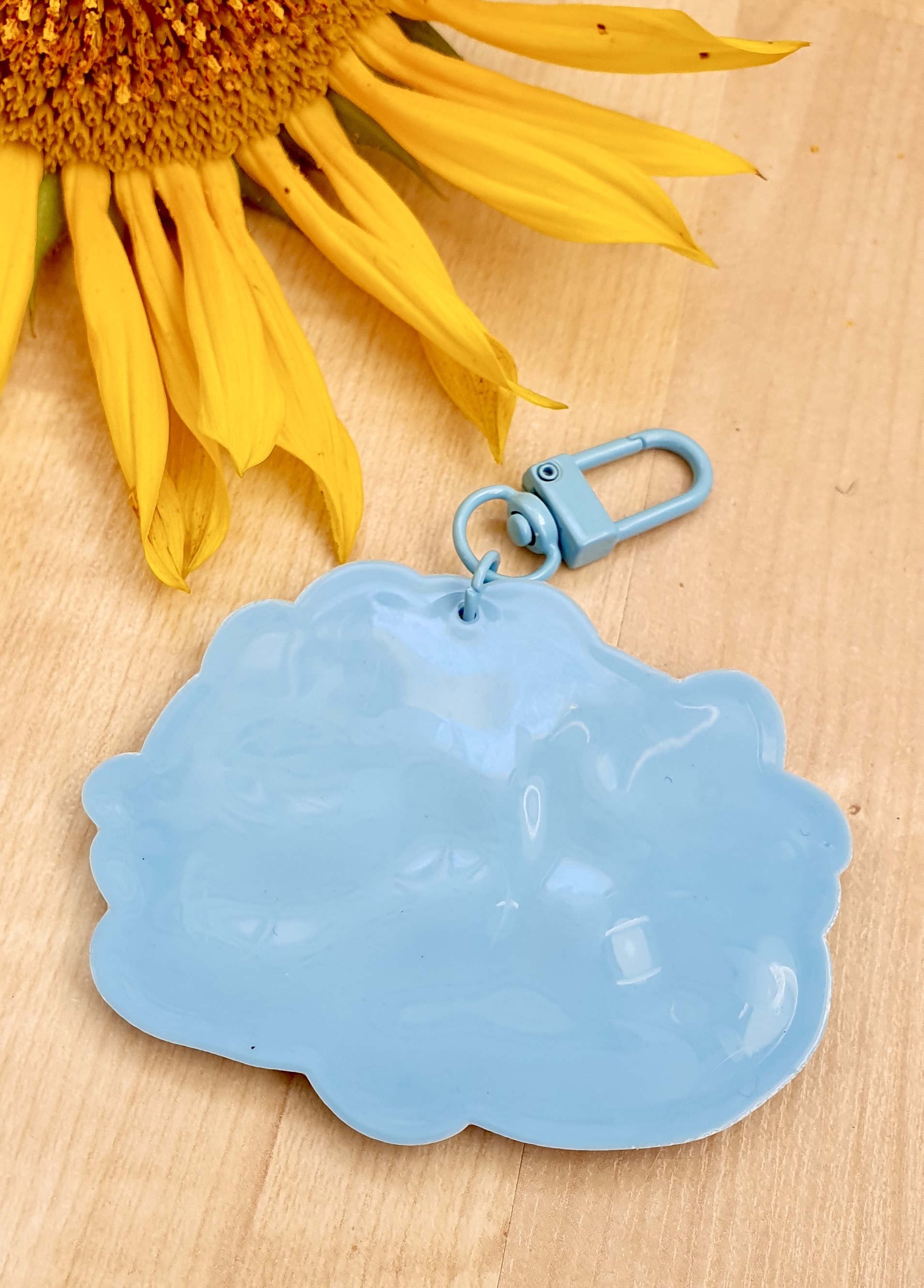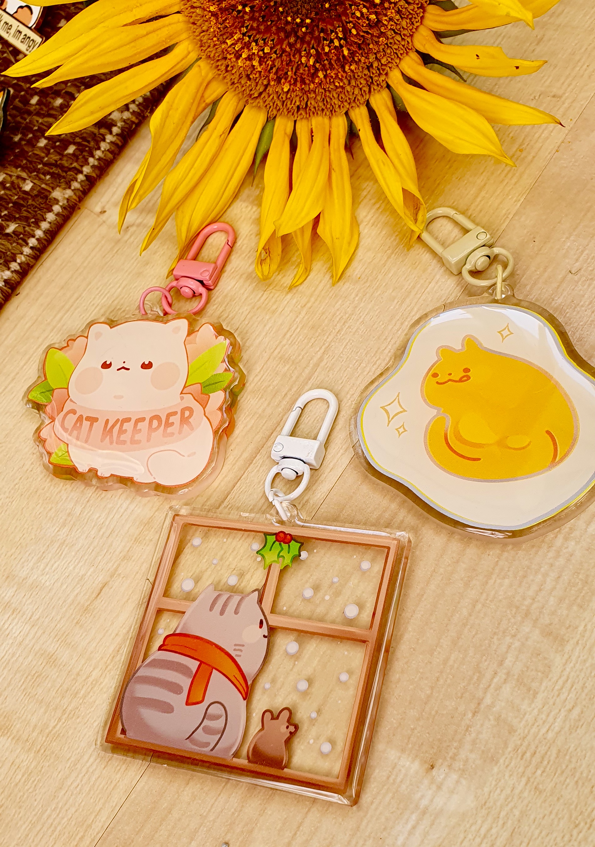 These are 2.5 inch double-sided acrylic charms with epoxy on the front. They all come with a cute colorful clasp and protective foil (to prevent scratches) that you can take off.